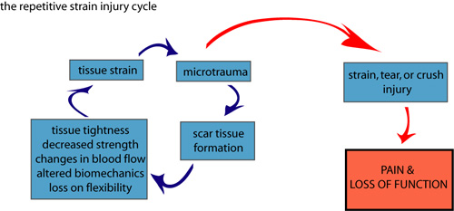 Throughout the day we are on our feet a great deal. As we stand, walk, or run, it places a tremendous amount of pressure on the foot. This creates a tension on the plantar fascia causing the muscles of the foot to contract to help support the arch and stabilize the joints of the foot. Over time the muscles and the fascia will become strained and fatigued, and can develop small amounts of injury known as micro-trauma. Simply stated, micro-trauma is very small scale damage that occurs in the muscles, fascia, and ligaments in response to small levels of strain. Initially this micro-trauma is not painful, but may be perceived as a mild ache or tightness in the muscles or at the heel where these muscles attach. Even though it is only small, this damage still needs to be repaired. The body responds to soft-tissue injury (including micro-trauma) by laying down small amounts of scar tissue to repair the injured tissue. Unfortunately, over time, this scar tissue will build-up and accumulate into what are known as adhesions. As these adhesions form, they start to affect the normal health and function of the muscles. In fact, they will often lead to pain, tightness, lack of flexibility, muscle weakness, compromised muscle endurance, restricted joint motion, and diminished blood flow.