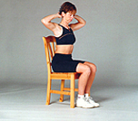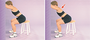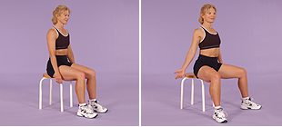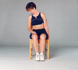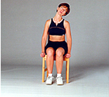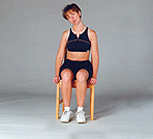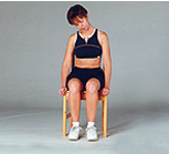 Sitting at edge of chair, feet and knees wider than pelvic width and rotated slightly outward.
