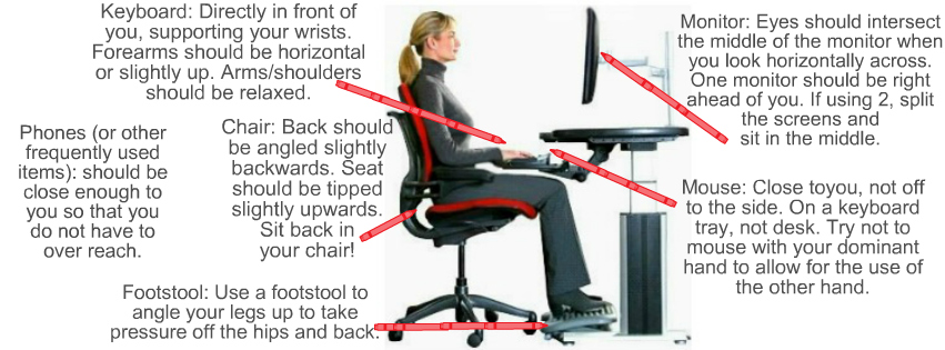 Often I have to speak to patients about their sitting habits. We think that the sitting is not the best for us but indeed part of the issue is the way in which we sit and use our workstation. I will outline the proper workstation set-up. You can also find a video we just produced below that will show you all of this.